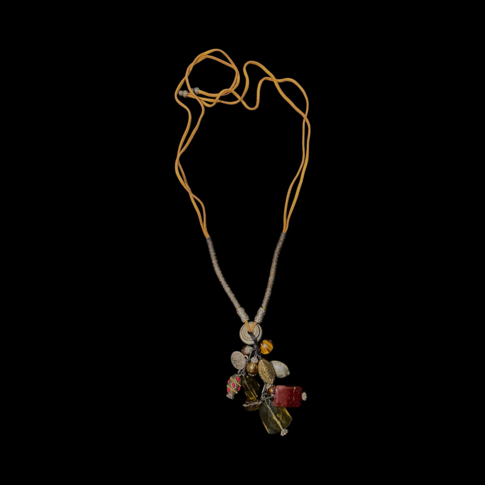 This beaded string tie necklace features a collection of unique stones, carefully assembled to create an elegant, customizable accessory. Its adjustable tie design allows for versatile styling, making it suitable for various necklines and occasions. Crafted with attention to detail, the necklace offers a sophisticated touch that complements both casual and formal outfits.