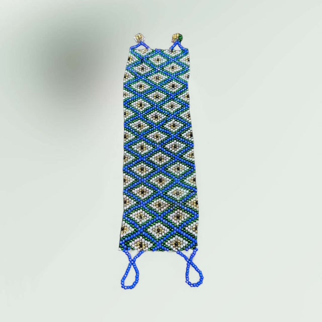 Add a touch of artistry to your look with this handmade beaded bracelet, crafted with care and precision. Featuring an intricate diamond pattern in vibrant blue, green, white, and black beads, this bracelet showcases traditional beadwork blended with modern style. Each bead is individually strung to create a stunning geometric design that stands out on any wrist.