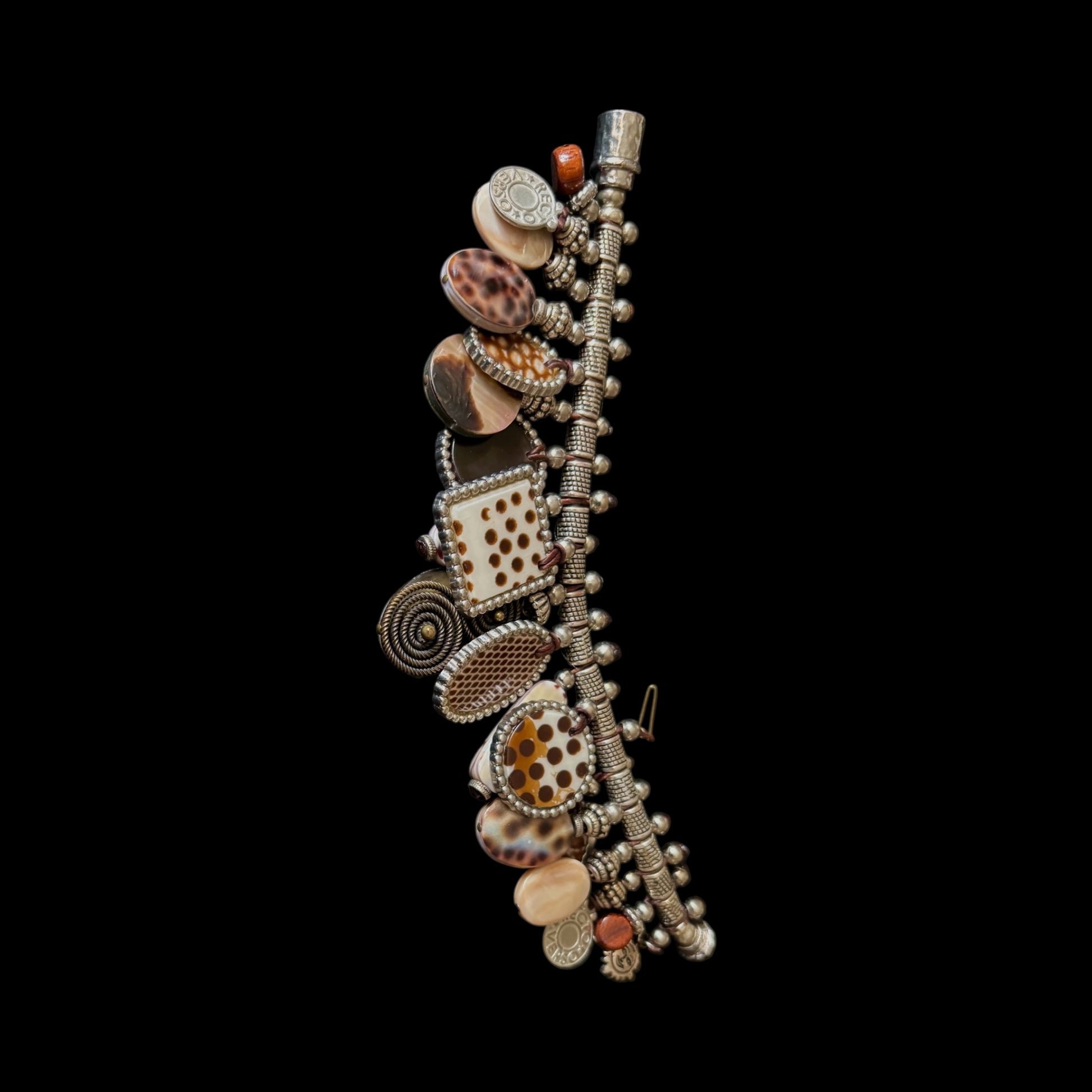 This finely crafted metal bracelet features a secure magnetic clasp for effortless wear and removal. Adorned with layered glass charms, it combines durability with a sophisticated aesthetic. The interplay of metal and glass offers a subtle yet striking visual contrast, making it a refined accessory suited for both professional and casual settings.