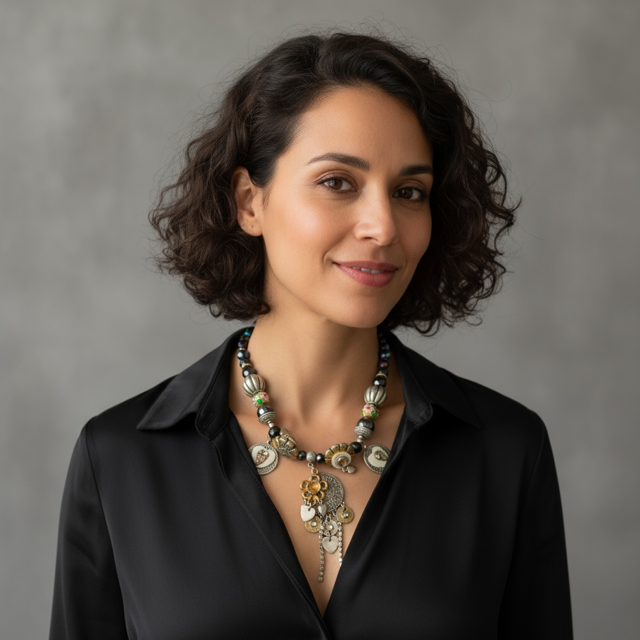 This necklace features an artful combination of stones and charms in various shapes, meticulously arranged to create a distinctive accessory. Each element enhances the piece’s texture and visual interest, making it a versatile addition for elevating any outfit with subtle complexity. Crafted for those who appreciate thoughtful design, it balances elegance with unique character.