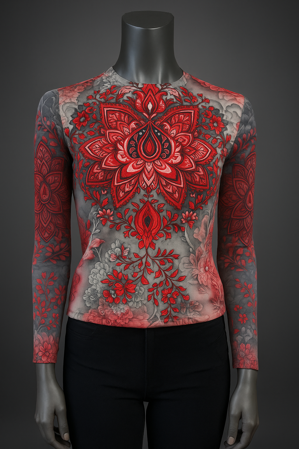 Printed T shirt with Mesh Sleeves with Embelishment Red Lily Print
