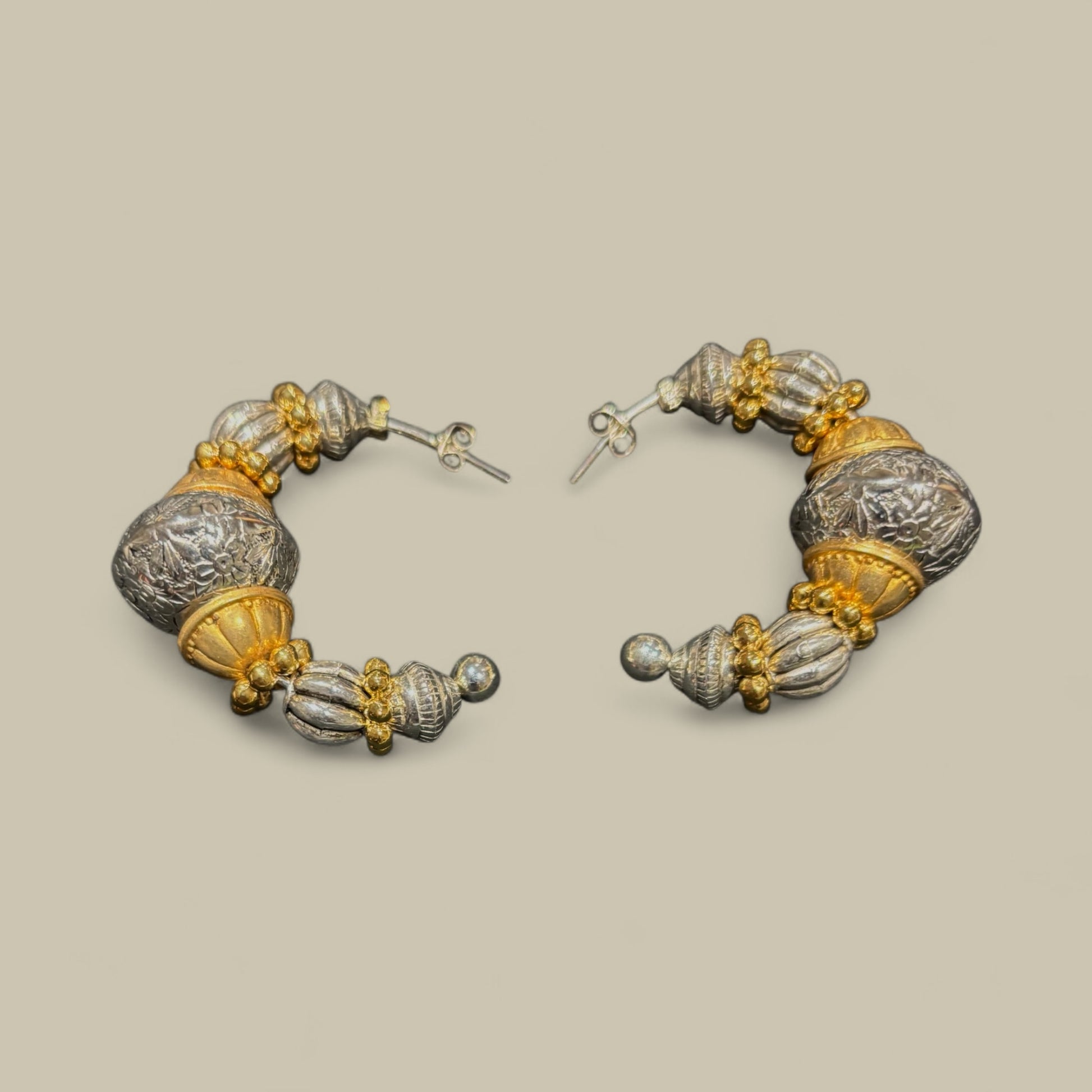 These pierced earrings feature intricately designed spherical forms crafted from silver- and gold-coloured metal. Their detailed craftsmanship ensures a refined and elegant accessory that complements both casual and formal attire with subtle sophistication. Durable yet lightweight, they offer lasting comfort while adding a distinctive touch to your jewelry collection.