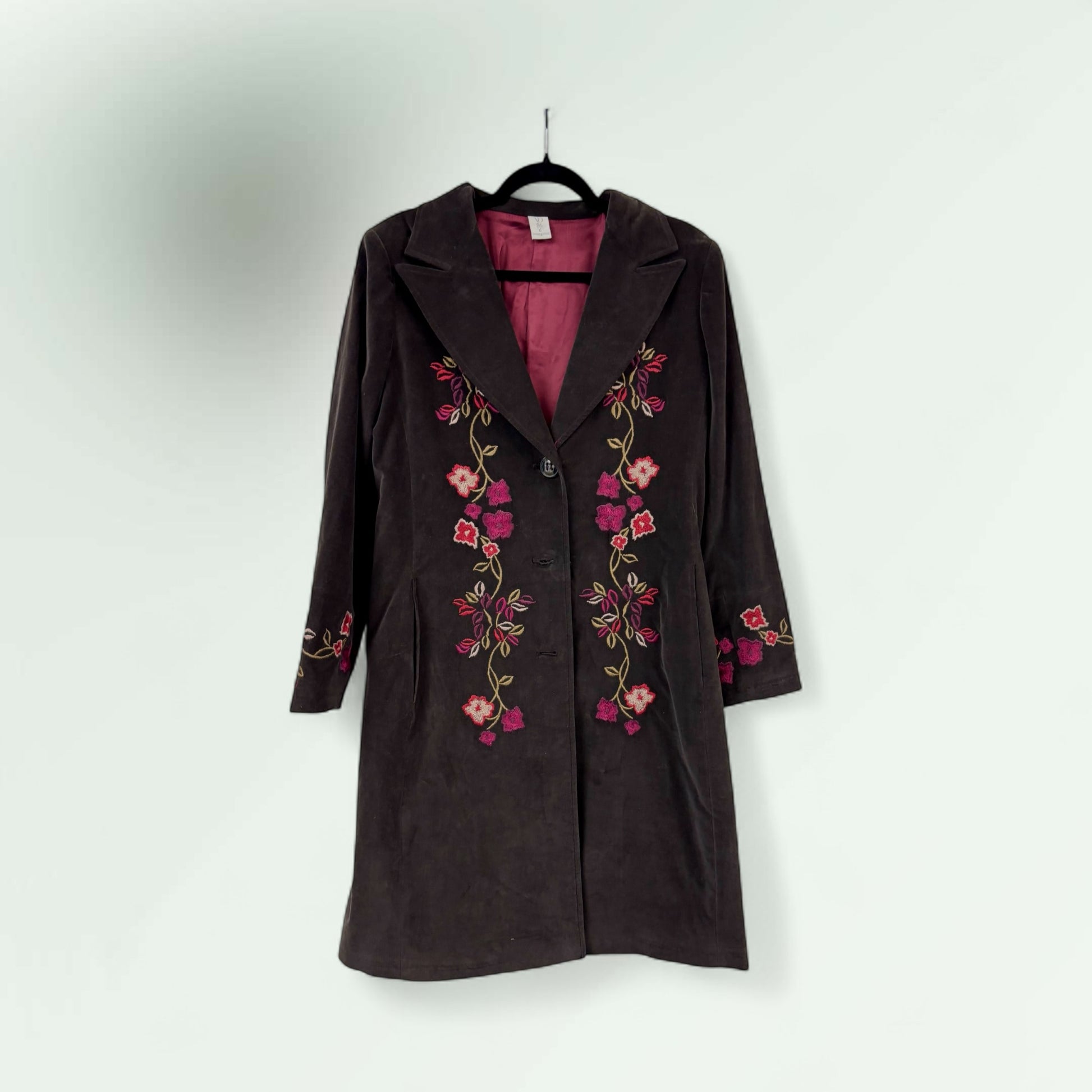 Crafted from sumptuous velvet with intricate embroidered detailing, this coat delivers refined elegance with contemporary edge. The luxurious fabric drapes beautifully whilst the embroidered accents add visual interest and artisanal character. Perfect for elevating evening wear or adding sophistication to everyday styling, this piece transitions seamlessly across seasons. A versatile investment that commands attention through understated luxury.